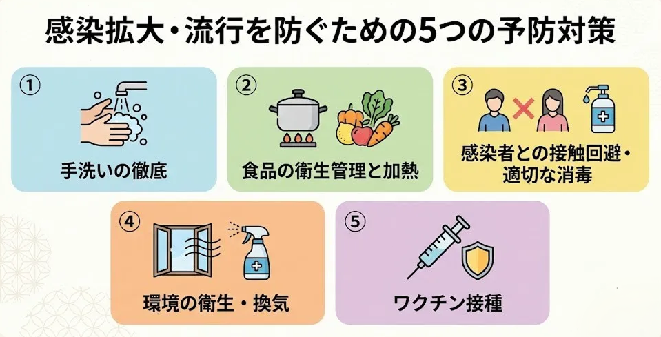 胃腸炎の予防には、家庭や職場でできる基本行動の徹底が欠かせません。