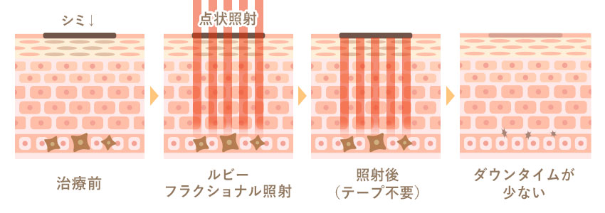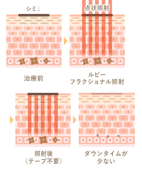 一方、ルビーフラクショナルは、ドット状の細かい点の集合体としてレーザーを照射する技術を採用。これにより熱の発生を大幅に抑え、次のようなメリットが得られます。